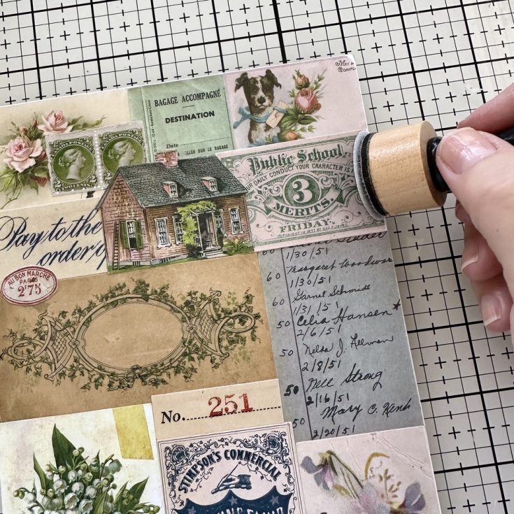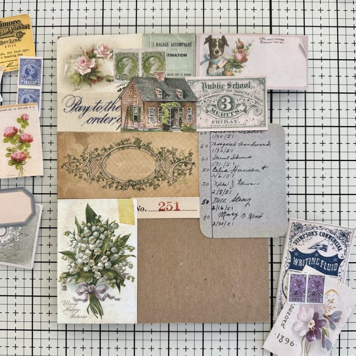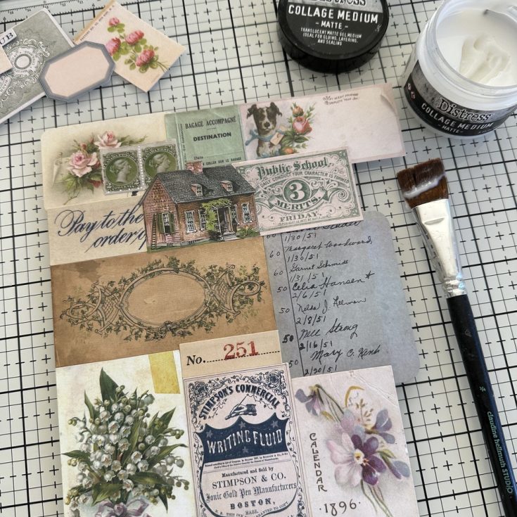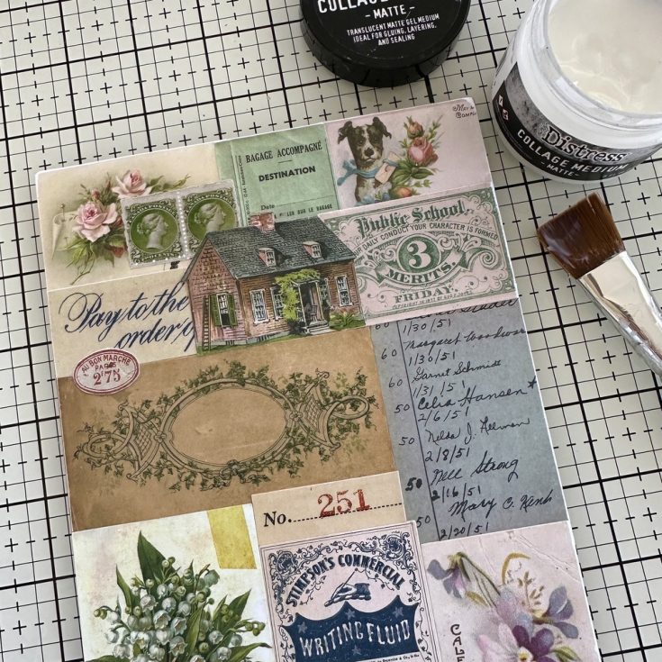 Once you have your arrangement, adhere each piece of ephemera with Collage Medium.