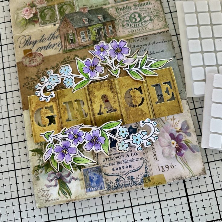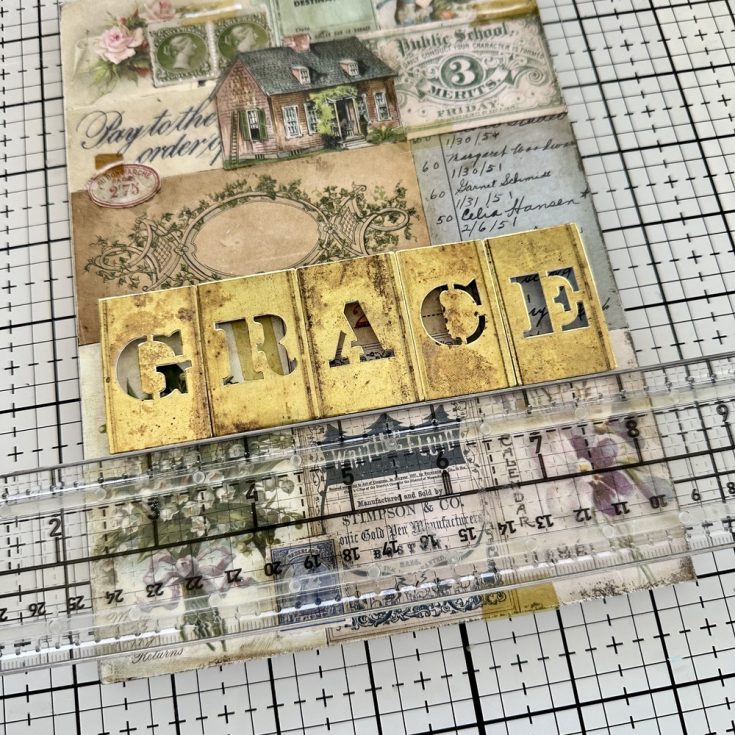 Align the panel with the lines on the Studio Mat. Use a clear Tim Holtz Media Ruler and the lines on the Studio Mat to create a straight edge for the Mini Stencil Chips. Peel the Foam Squares and adhere the word to the surface. Set aside.