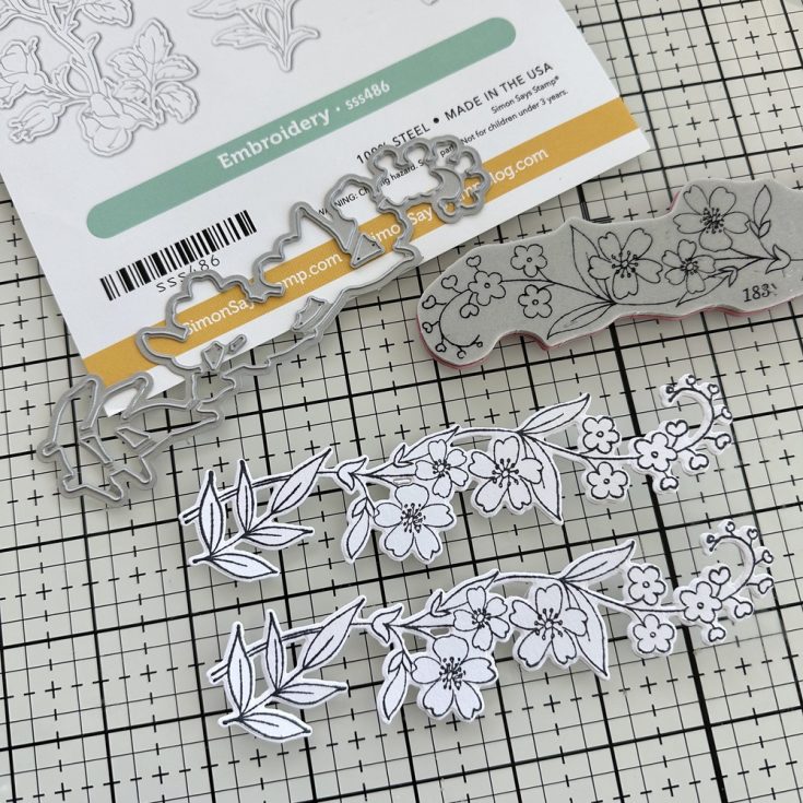 Using Black Soot Archival Ink, stamp Distress Watercolor Cardstock with floral image from the Stampers Anonymous Embroidery set. Repeat to get a second set of florals. Use the matching Simon Says Stamp Embroidery wafer die to cut out the two florals (so EASY!)