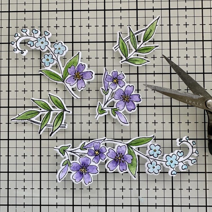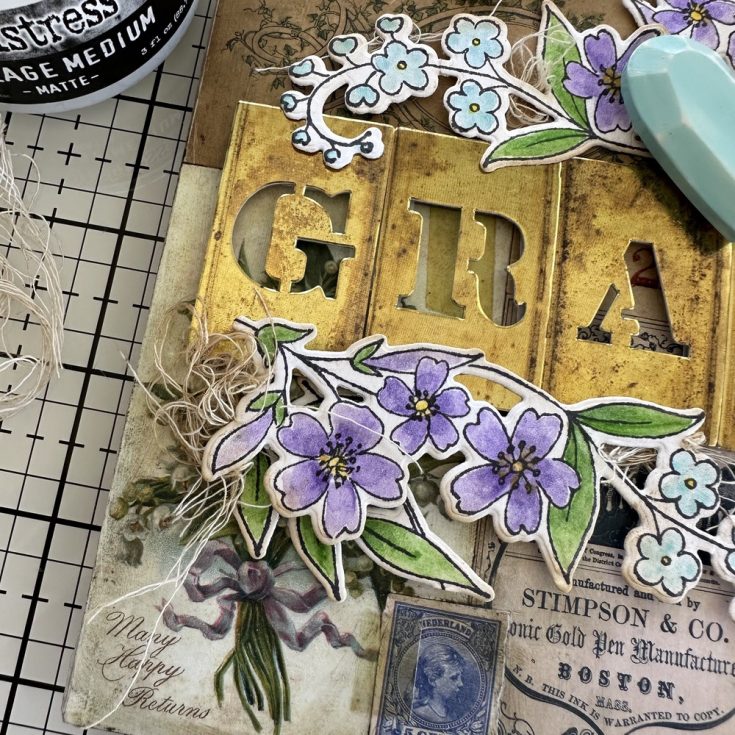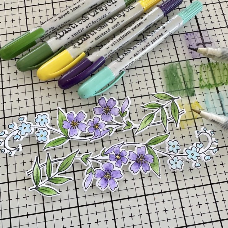 Color floral using Distress Crayons. Scribble crayons onto the Studio Mat, pick up with a damp Detailer Water Brush and color in the floral image. I used a combination of Mowed Lawn and Rustic Wilderness for the leaves, Villainous Potion and Mustard Seed for the larger flowers and Salvaged Patina for the smaller flowers. Simon Says Stamp sells each crayon separately so you can pick and choose the individual colors you want!