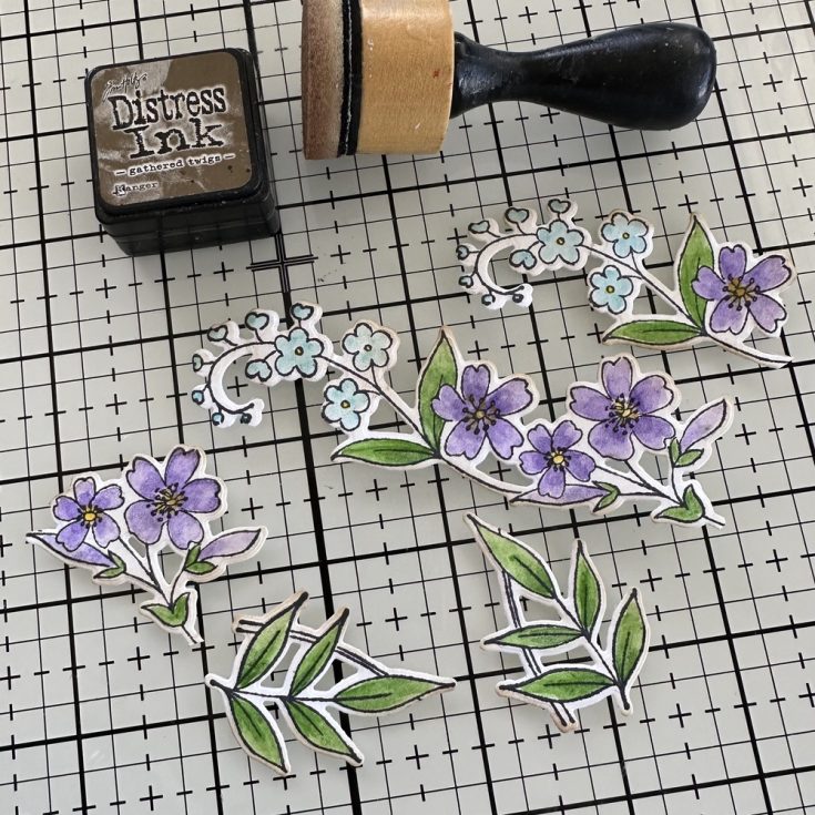 Lightly ink edges of the die cuts using a Mini Blending Tool with foam pad and Gathered twigs Distress Ink.
