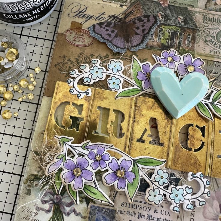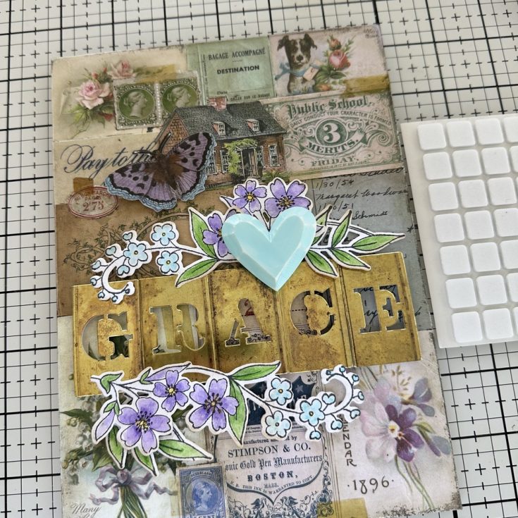 Add 3D Foam Squares to the top portion on the Salvaged Heart so it will sit at the same level as the bottom portion that is resting on the Mini Stencil Chips. Locate a purple butterfly in the Palette Ephemera pack. Adhere the body of the butterfly with Collage Medium and the wings with 3D Foam Squares so it appears to be flying away.