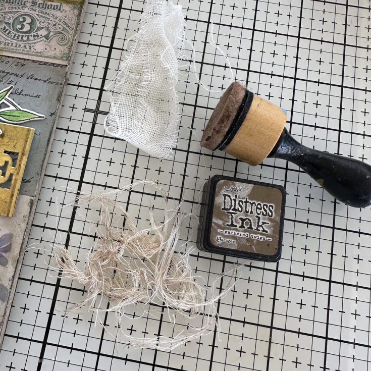Cut a couple 2” pieces of Mummy Cloth. Lightly Ink with Gathered Twigs Distress Ink. Once inked, shred the Mummy Cloth into strings.