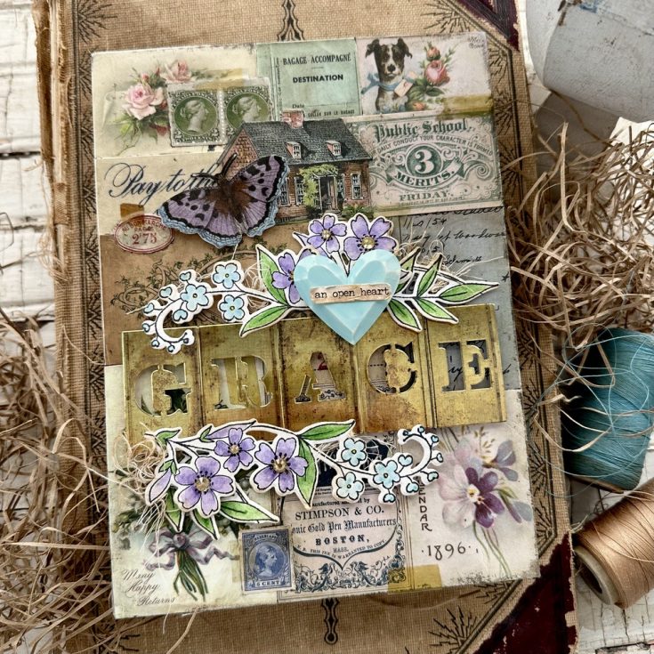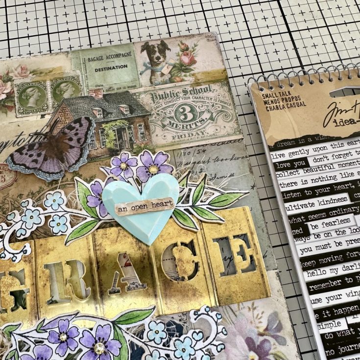 The very last step is to reinforce the theme with words from the Small Talk Sticker Book, “an open heart”. I used the leftover ink on my Blending Tool to age the paper, then scuffed and wrinkled it up just a bit before adding it to the Salvaged Heart.