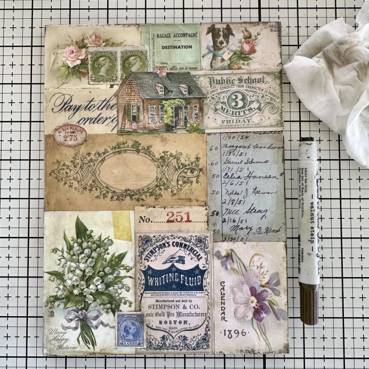 Once the surface is completely dry, scribble Walnut Stain Distress Crayon over the edges and on the seams between ephemera pieces. Rub the crayon with a damp fingertip or pounce here and there with a wet wipe. If you add too much crayon, pounce wet wipe over the surface to remove. Let dry.