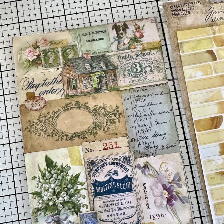 Add 5- 6 small Cello Tape Stickers on the edges and seams of the panel so the ephemera appears to be taped together in multiple places. Set aside.