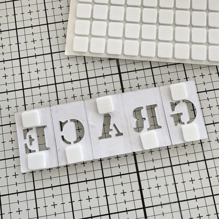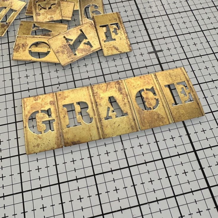 Gather Mini Stencil Chips to spell out the word GRACE. Combine the letters using scotch tape on the back side.