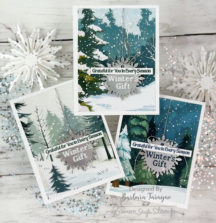 Start by die cutting the Simon Says Stamp Frosty Tree Gathering from watercolor paper three times.
