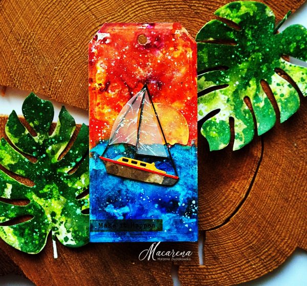 Macarena was inspired by the beautiful sunsets she experienced in Spain and made a tag reflecting one of them. She built up the sunset colors using mainly Tim Holtz Distress Mica Stains and a strongly pigmented Tim Holtz Distress Oxide Reinkers. She saved the colors in between the layers using Ranger Dina Wakley Media Clear Gloss Spray. She used also Spellbinders Set Sail Etched Dies.