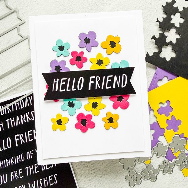 Cheiron is wishing for spring!!! She created a card with some tiny spring blooms using the Simon Says Stamp Simple Flowers Wafer dies. She cut her flowers out of colorful spring colored cardstock and layered them over Simon Says Stamp Black Cardstock to really make them pop. She added a sentiment from the Simon Says Stamp EZ Strips XL Reverse Basics that she cut with the EZ Strips Banners Wafer die.