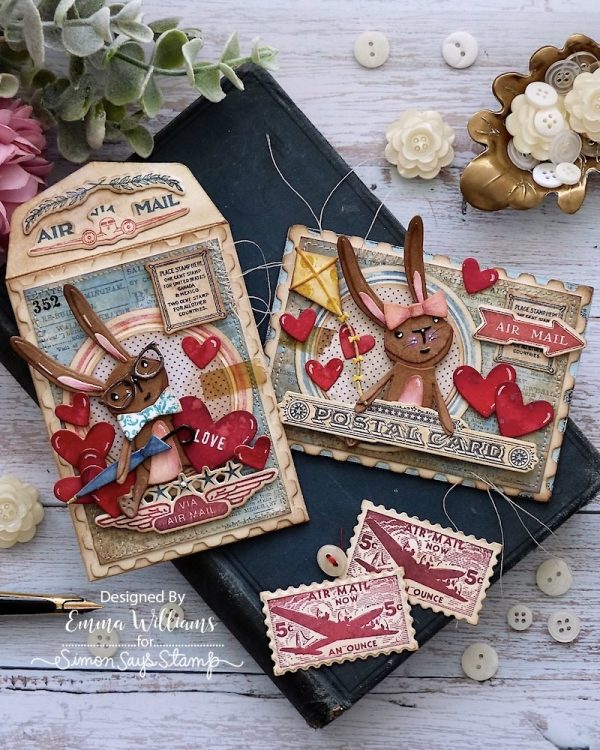 Emma was inspired by the lyrics of the song, Come Rain Or Come Shine because whatever the weather, love is all around! She used the bunnies from the Sizzix Vault Bunny + Chick Thinlits Dies by Tim Holtz as focal points on her envelope and postage stamp set. She added die cut hearts from the Lovebirds die set and completed these pieces by adding stamped and die cut ephemera using the Correspondence Stamp and SSS Die Bundle.