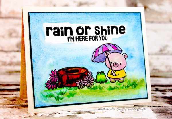 Meihsia was inspired to create a card using Simon Says Clear Stamps Rain or Shine on the background, and colored it with Copic SKETCH 72 PC SET B Markers and Zig Kuretake Gansai Tambi 24 COLOR Set.
