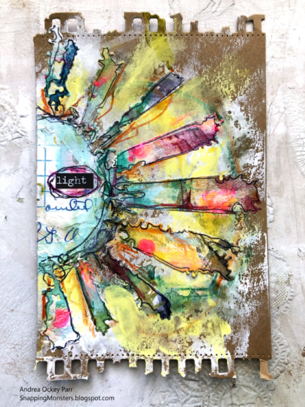 Maura was inspired by the movie “Mary Poppins” as she was working on her color wheel tag. She used Tim Holz’s Wheel Layering stencil on a Dina Wakley Media Tag, and blended Simon Says Stamp Inks from Apple to Amethyst.