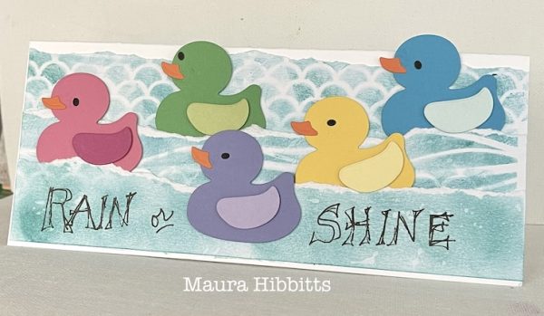 Maura was inspired by the resilience of ducks to thrive in any weather. She made a card using Simon Says Stamp’s Rubber Ducky die, Simon Says Stamp Waves stencil and Simon Says Stamp Rainbow Splash cardstock.