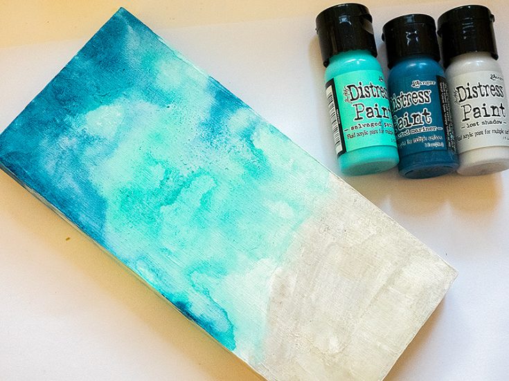 When the gesso is dry, paint with Distress Paint. Add a little water to the paint and mist with more water to blend. I used Salvaged Patina, Uncharted Mariner, Rustic Wilderness and Pine Needles.