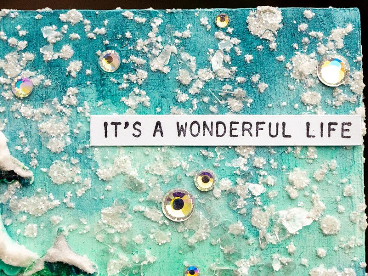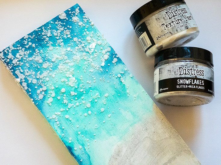 Apply texture paste through Tim Holtz Speckles stencil and sprinkle with Distress Snowflakes – which is a mix of glitter and mica flakes.