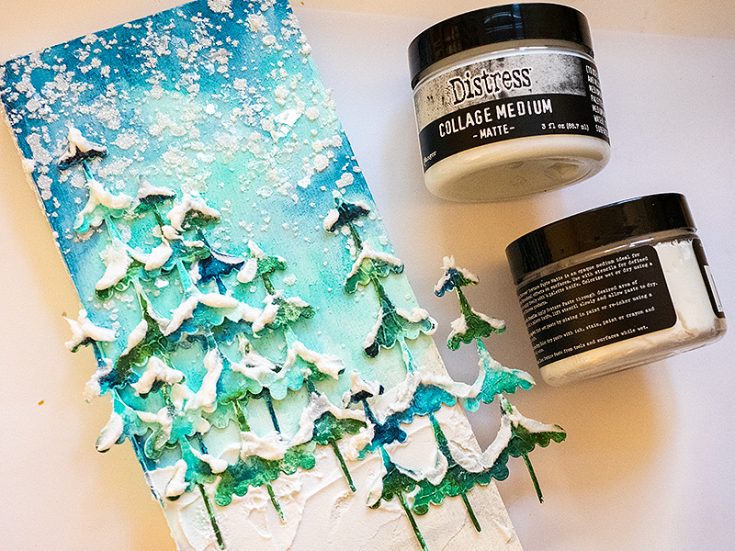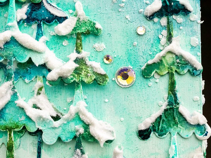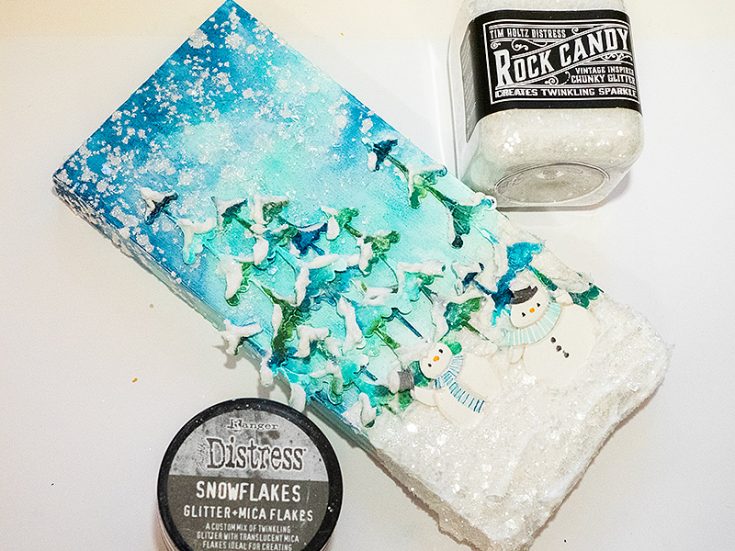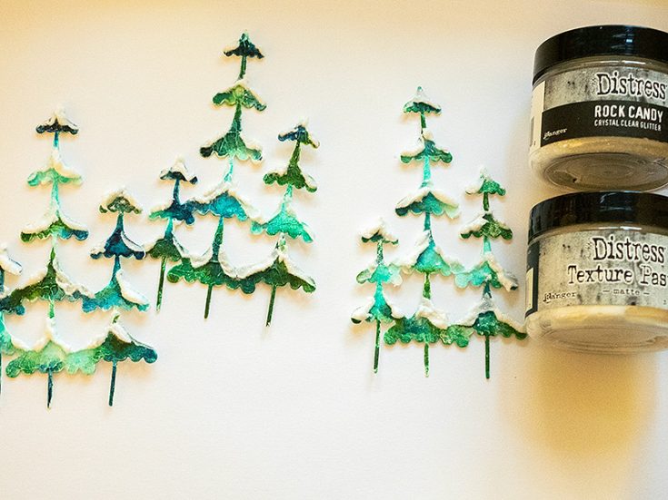 When the paint is dry, apply Ranger Distress Texture Paste to the trees and sprinkle with Rock Candy glitter.