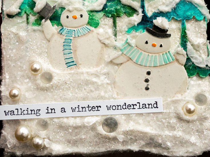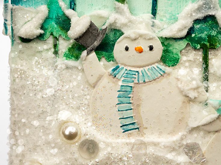 Add a thick layer of texture paste with a palette knife, forming it to create snowy hills. Press the snowmen into the paste. Sprinkle with Snowflakes and Chunky Rock Candy glitter.