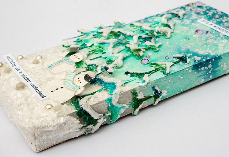 I had a wooden piece at home and decided to turn it into winter / Christmas décor. You can of course make a card instead, or do the techniques on a canvas. My piece of wood is 3.8×8.2 in. I used dies from Simon Says Stamp And Everything Nice and DieCember® releases, combined with fun paint, media and glitter.