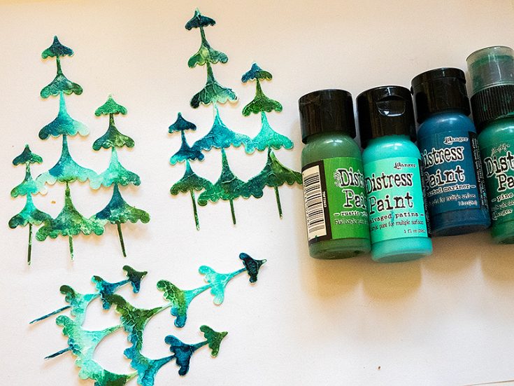 The trees have interesting texture because of the gesso and since the Distress Paints have blended in different ways.