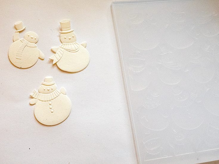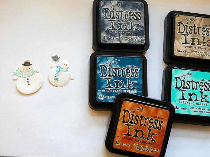 When the snowmen are dry, apply Distress Ink to a non-stick craft sheet, mist with water and add a little color to the snowmen. I decided to only use two of the snowmen.