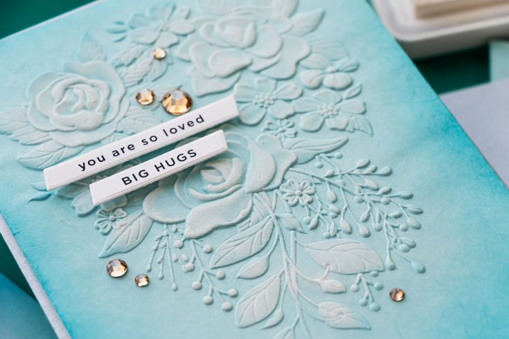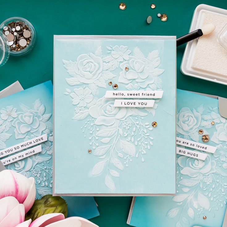 Today’s cards feature the Simon Says Stamp Fancy Rose Bouquet embossing folder. While this particular folder includes coordinating dies, I am only using the embossing folder itself. The techniques shown here can be applied to any embossing folder, regardless of brand.