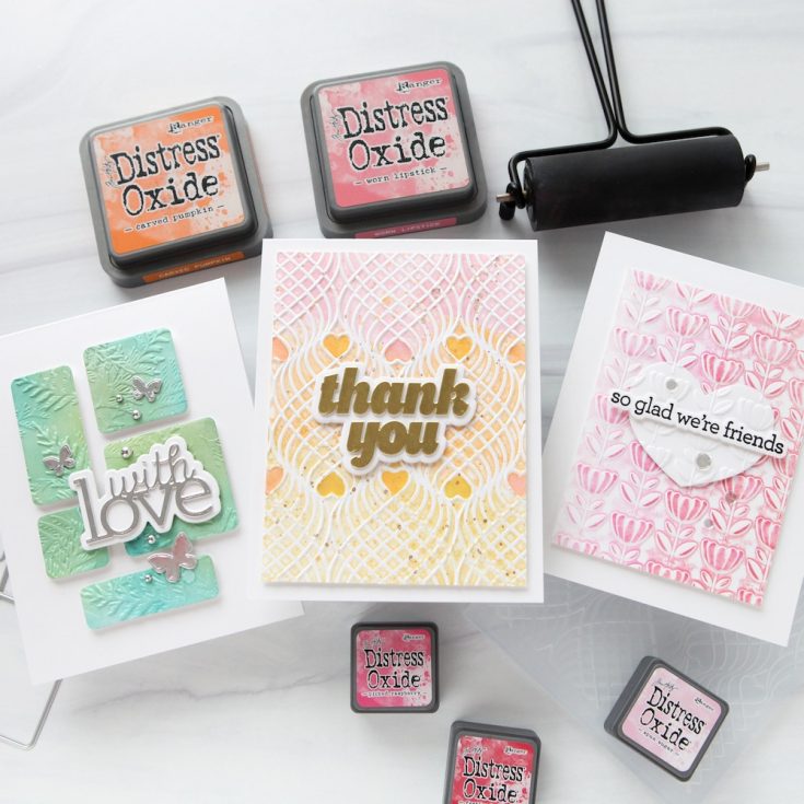 - Use ink cubes to apply a stripe directly to the brayer in 3 colors in a similar family and roll on the debossed side of the folder, run through embossing folder, and for extra color and interest, use up extra ink from brayer directly on embossed panel
