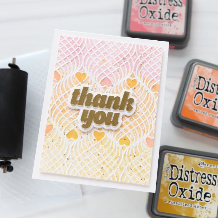 - Ink blend the card base with 3 analogous ink colors. Use our layering template and dies. Create a template for your card, die-cut your blended panel, and use the embossed side to emboss the pieces