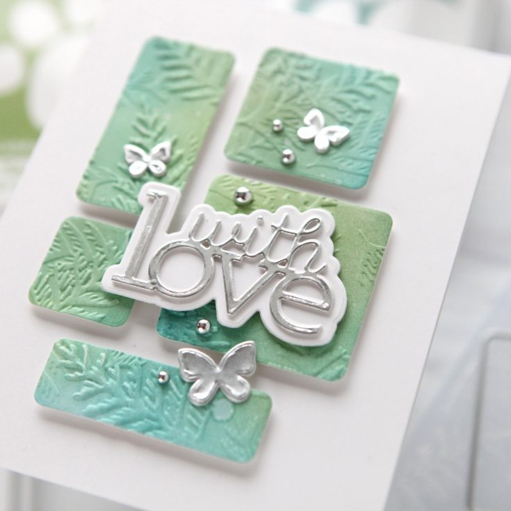 - Pick 3 colors that blend well together and blend a card panel. Create your own background by using a mixture of stamps in slightly darker colors as well as the white pigment ink for a pop of ghosting. Trim off a diagonal corner to leave an open space for a sentiment. Emboss over this background.