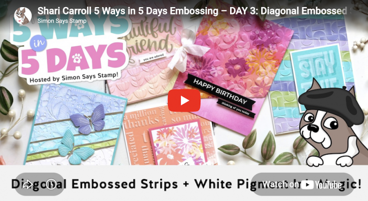Throughout this series spanning March 30th – April 5th, you’ll be learning 5 unique ways each day to use our fan-favorite Simon Says Stamp 3D Embossing Folders. (Plus! Spoiler alert, you’ll actually have 7 DAYS of education with 2 bonus posts over the weekend! That’s a total of 35 crafty ideas that will be provided for you for FREE to keep your creative juices flowing!!) Today we’re going to focus on Diagonal Embossed Strips + White Pigment Ink Magic!