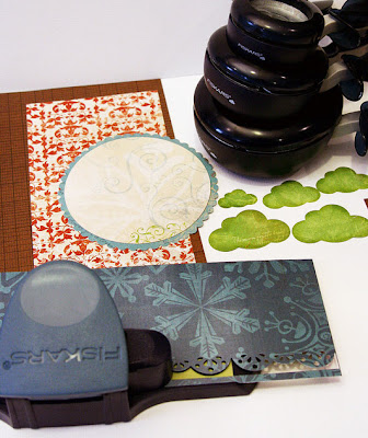 Combine: Fiskars Cloud Punches in Medium / Large / Extra Large, Blitzen Papers by Bo Bunny cut down to 5″ x 7″ with the Fiskars Paper Trimmer, and a Tape Runner.