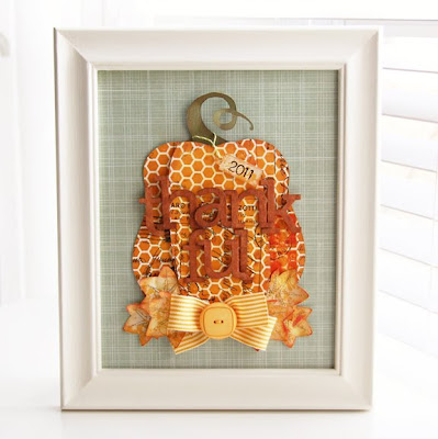 I machine stitched the veins, crumpled the leaves, and then adhered them to each side of the pumpkin. I finished with a bow and button at the center.