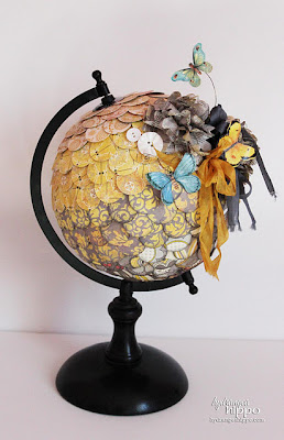 I came across this project when I was visiting the Clearsnap website, it’s by a wonderful artist named Jennifer Priest – what a cool idea to make an altered globe!!! All you need is a globe (they said it was found at Target), a circle punch, Smooch Spritz (might I recommend Gold Glow?), papers – the ones they use are from the 6 x 6 Blissful paper pad by Authentique, but also resemble and coordinate with the 6 x 6 Sunshine pad by My Mind’s Eye.