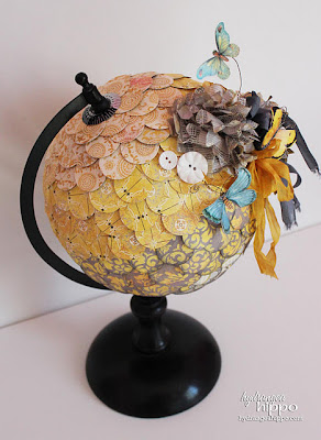 I came across this project when I was visiting the Clearsnap website, it’s by a wonderful artist named Jennifer Priest – what a cool idea to make an altered globe!!! All you need is a globe (they said it was found at Target), a circle punch, Smooch Spritz (might I recommend Gold Glow?), papers – the ones they use are from the 6 x 6 Blissful paper pad by Authentique, but also resemble and coordinate with the 6 x 6 Sunshine pad by My Mind’s Eye.