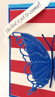 Trim the strips. Now the newly created strip paper is ready to die cut with the butterfly. Mount the striped paper on some medium blue paper and glue the butterfly with a dab of glossy accents. Free cut an elongated “Y” for the stamen of the butterfly and coat with glossy accents. When dry, attach to the butterfly.