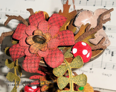 “I used the Spool and smallest flower from the Art Part Sample pack, Distress Inks [Crushed Olive, Scattered Straw, Rusty Hinge, Wild Honey, Forest Moss, Barn Door] and Stains in Crushed Olive, Scattered Straw, Rusty Hinge, Wild Honey, Forest Moss, Barn Door. Archivals in Olive, Sepia and Jet Black. Studio 490 stamps, Alterations Movers & Shapers: Tattered Leaves, Branch and added in some Idea-ology Memo Pins with Glossy Accent middles. The little mice and pumpkins are made from modelling clay and distressed with Dabbers.”