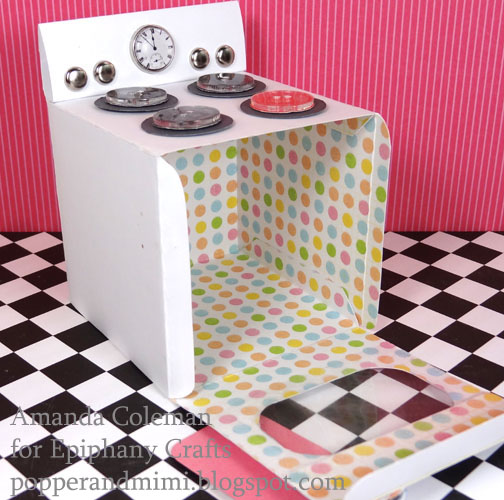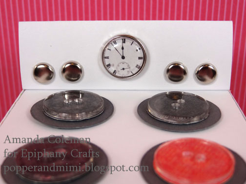 From Amanda: “The control panel is embellished with 4 small brads and a custom Round 14 brad and bubble cap. The stove burners are made with Button Studio Tool Round 20 and buttons. Each burner sits on top of a 1″ gray circle.”