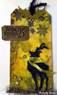 Last year was my first year of doing the 12 tags of Christmas and I had the best time ever! Everyday when I woke up, I had to look at the new tag. Thought about it all day and raced home from work to make it. It was such a wonderful rush and learned so much! My inspiration for this tag is day 1 of 2009, because I’m so mesmerized by the beautiful background with the Rock Candy Crackle Paint. For my version I did it in my Christmas home decor colors, which are lime, black, gold and a little bit of silver. So I used Shabby Shutter, Peeled Paint and Crushed Olive Distress ink for the background. The Snowflakes are stamped with Archival Jet Black ink. The reindeer and holly are covered with Rock Candy Dry Glitter which is colored with Pitch Black, Lettuce and Citrus Alcohol Ink.