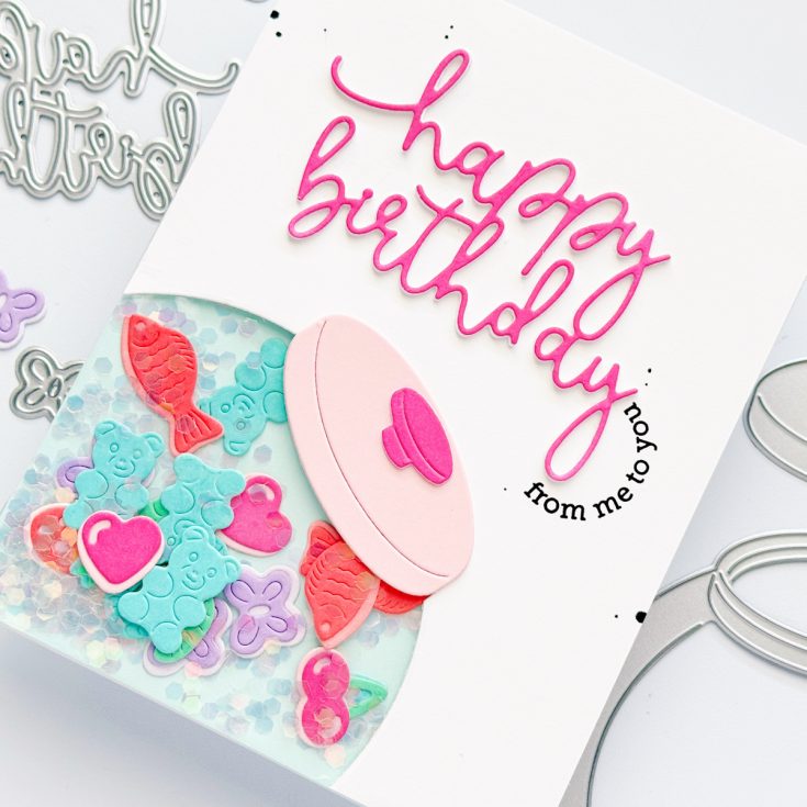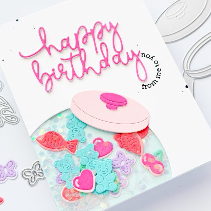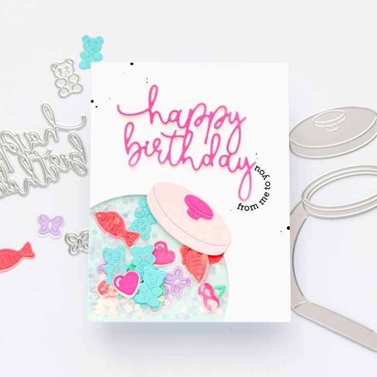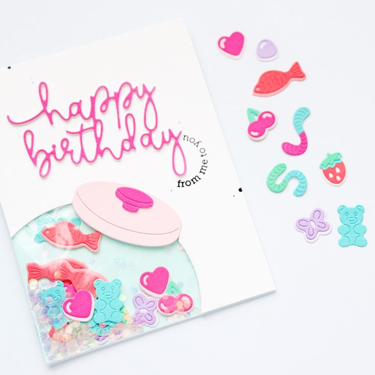 This wrapped shaker is very easy to create with the Penny Candy Jar as a window and some crafty trash to create a shaker pocket underneath. Paper candy makes fun shaker bits and is super relaxing to create! Check out the process in the video…
