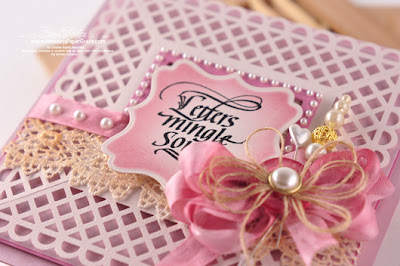 I love the embellishments used on this!  The lace, custom colored ribbon, twine, and the different sized pearls really make it swanky!