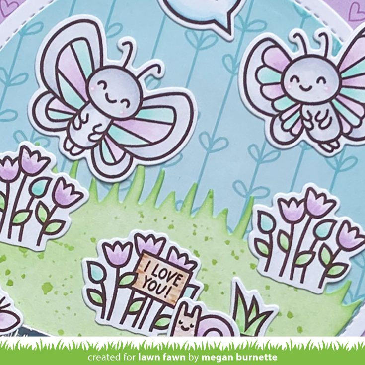 Lawn Fawn’s February Spring Release is chock full of adorable critters and accessory sets! For my project, I began by stamping out images from the I Like Big Butterflies, All the Grasses, To My Fungi, Porcu-pine For You, and Spring Basket Stamp Sets. After coloring them using Copic Markers, I cut them out using the coordinating dies.