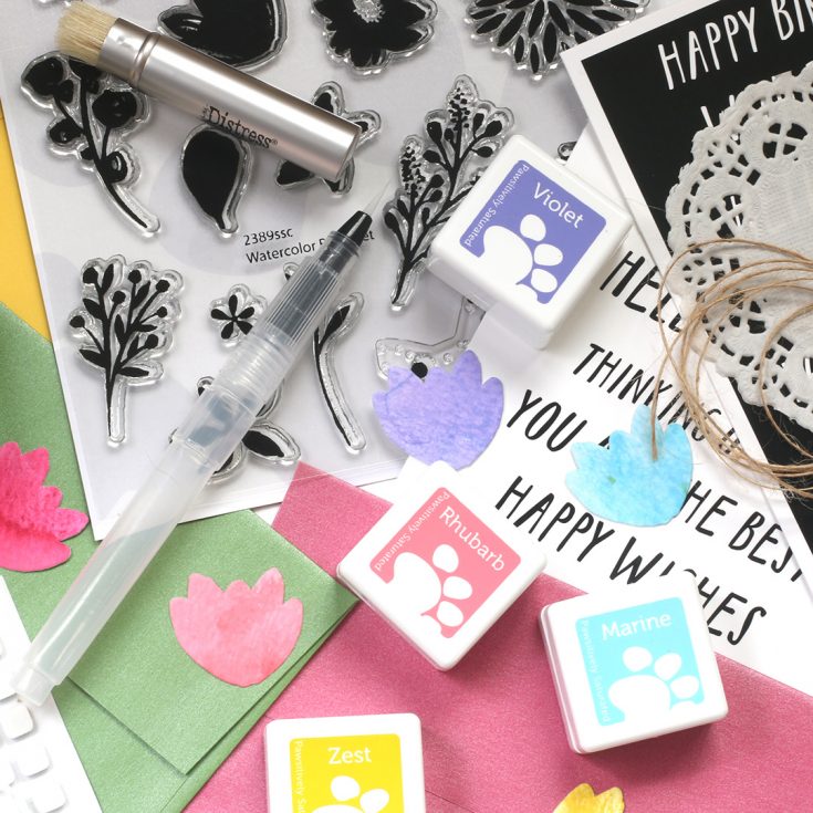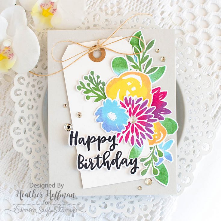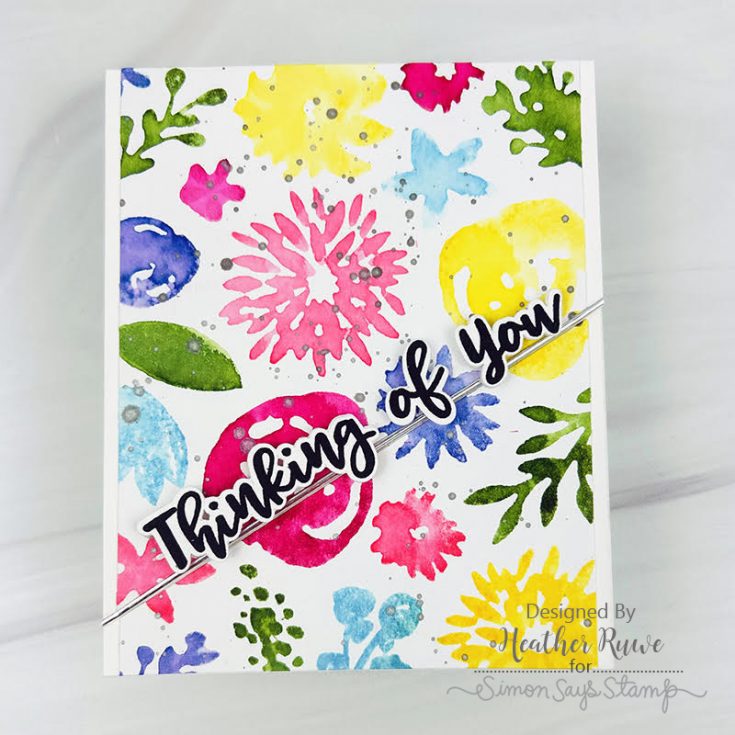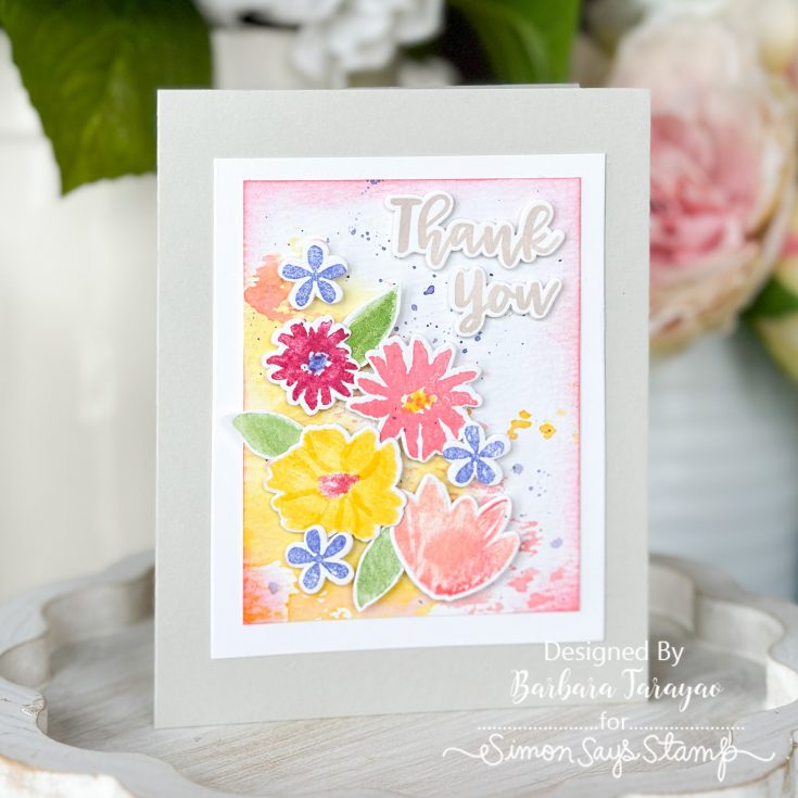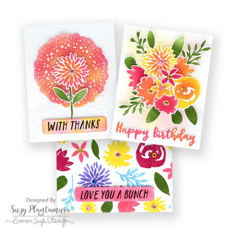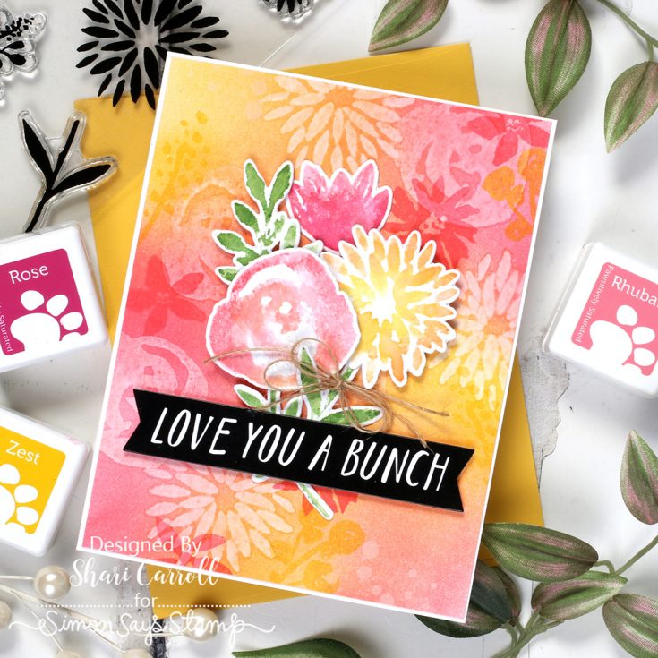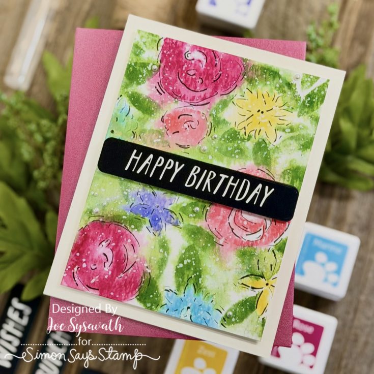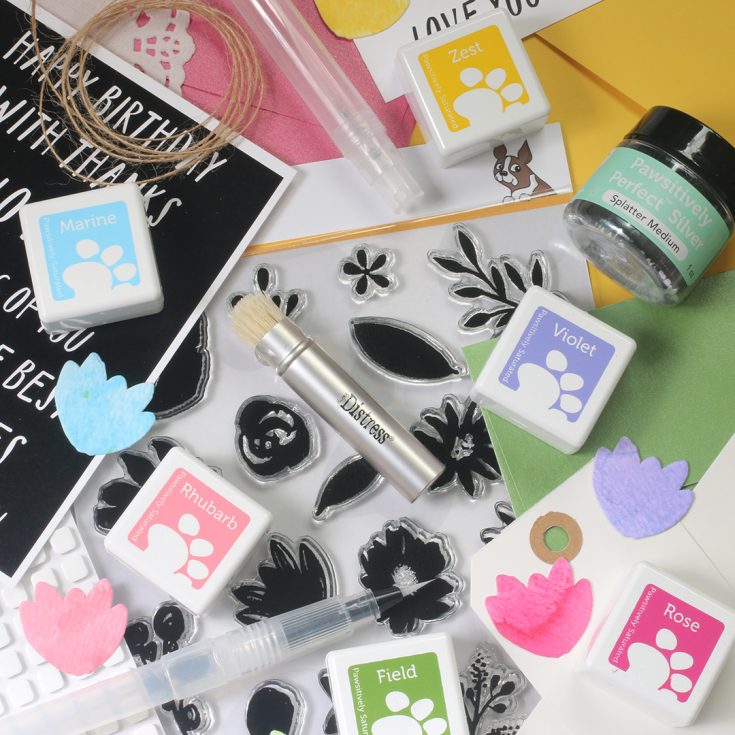 This cheerful kit features the following Simon Says Stamp exclusive products: the Watercolor Bouquet 6×8 stamp set, the Basics and Reverse Basics XL EZ strips, a custom 6 pack of Pawsitively Saturated ink cubes, and one jar of Pawsitively Perfect Silver splatter medium.