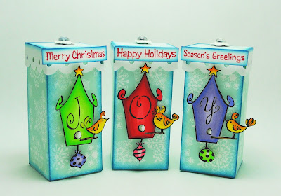 - Stamp the sentiments from Winter Magic in Crimson Red VersaFine (or ladybug Memento) on small banners cut from white cardstock and edged with Teal Zeal Memento ink. Attach with dimensional foam.