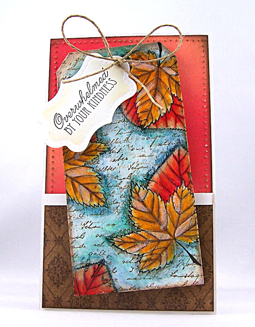 Stamp Penny Black 1999L Letter Background onto the tag using Tsukineko VersaFine Toffee Ink. Before the ink dries, rub the letter background stamping off of the leaves with your fingertip. Apply heat to ensure the stamping is dry and then add a touch of Gathered Twigs Distress Ink around the tag. Ink the card base with Distress Ink (Festive Berries, Dried Marigold, and Fired Brick, and Gathered Twigs) and stamp Penny Black 40-169 Diamond Pattern with Gathered Twigs Distress Ink onto the bottom portion of the card. Finally, add piercing around the top of the card base and adhere the tag on top, mounted with dimensional adhesive. Stamp sentiment was with VersaFine Onyx Black ink onto Spellbinders die (Twisted Metal Tags and Accents) inked with Antique Linen Distress Ink. Finally, adhere a twine bow with Glossy Accents.