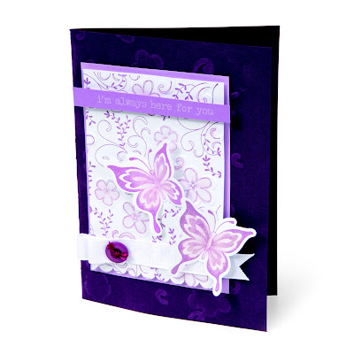 Monochromatic color schemes are so neat – and they are fairly simple to create. Just pick a color you like and find slight variations in shade! Use white or black to help neutralize : ) I like that it’s not boring – the butterflies pop off the page, the grosgrain ribbon and button help add texture, there is variation in ink color and the patterns, and the different layers of paper are great!