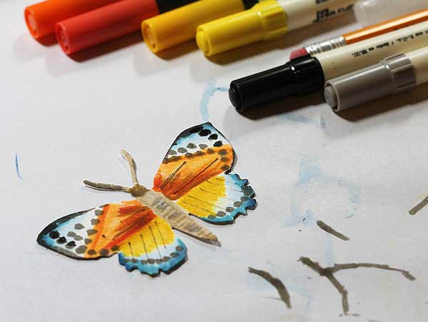 Start out by cutting a butterfly out of watercolor paper. Then color the body and the wing tips. Go over them with a detail water brush and tah dah! You are on your way.