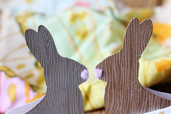To finish up, adhere a pom-pom tail to each bunny, then cut out a banner and stamp each person’s name with gold ink. Adhere with foam tape and you are done!