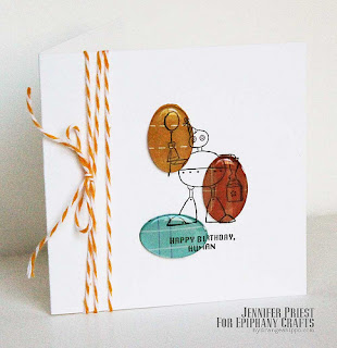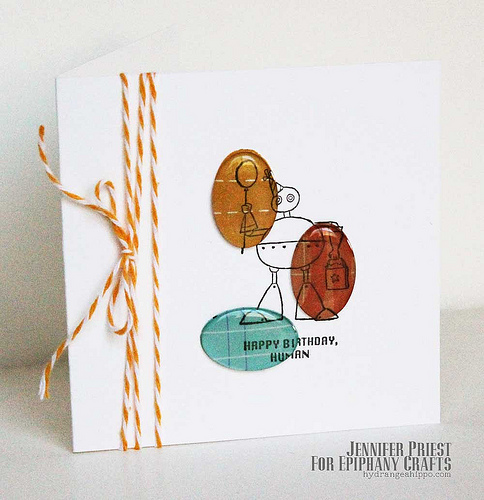 Don’t you love this technique from Jennifer Priest? Here’s her instructions on how to recreate this: “The oval tool has a nice slim profile, making it fun to create a pseudo masked or window effect on cards. Stamp an image onto a blank card front. Then stamp the same image onto scraps of paper. Use the Epiphany Crafts Shape Studio to create embellishments from parts of the colored image and then apply to the card front, matching them up to the plain stamped image on the card. This technique will work with any Epiphany Crafts Shape Studio but the oval is well-suited for narrow images.”