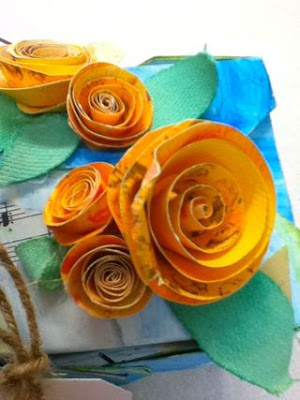 Jennifer made these gorgeous flowers using watercolor paper, more Gelatos, Art GRIP Aquarelle Watercolor Pencils, and Bubblewrap stamp with the Stamper’s Big Brush Pen in Black. For extra texture, the leaves were cut out of canvas!