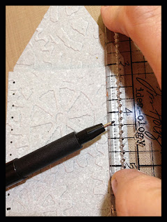 Still on the cutting mat, stack the piece you just cut on top of the piece that’s intact so the sides and bottom align perfectly. Use the ingenious Tim Holtz ruler to plot guide holes for your stitches. I spaced mine 1/8 inch from the edge, and 1/4 inch apart. The see-through ruler makes it really easy to line everything up just the way you want it!